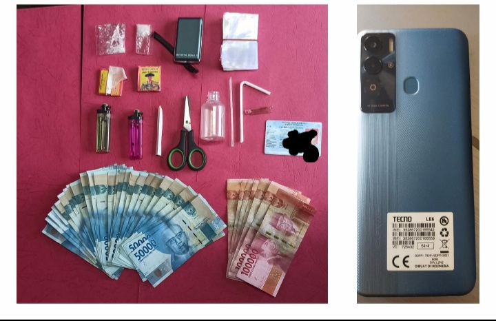 Selanjutnya tim melakukan pengeledahan terhadap saudara ES beserta tempat tinggalnya dan seputaran kebun milik saudara ES, Dalam penggeledahan tersebut tim menemukan barang bukti berupa 2 (dua) paket diduga Narkotika jenis sabu, 1 (satu ) set alat hisap sabu atau bong, 1 (satu) unit timbangan digital, 1 (satu) ikat plastic bening, 1 (satu) buah sendok kertas, 2 (dua) buah mancis rakitan, dan barang bukti lainnya. 2 (dua) bungkus papier a cigarettes merk TOREADOR, 1 (satu) buah gunting.