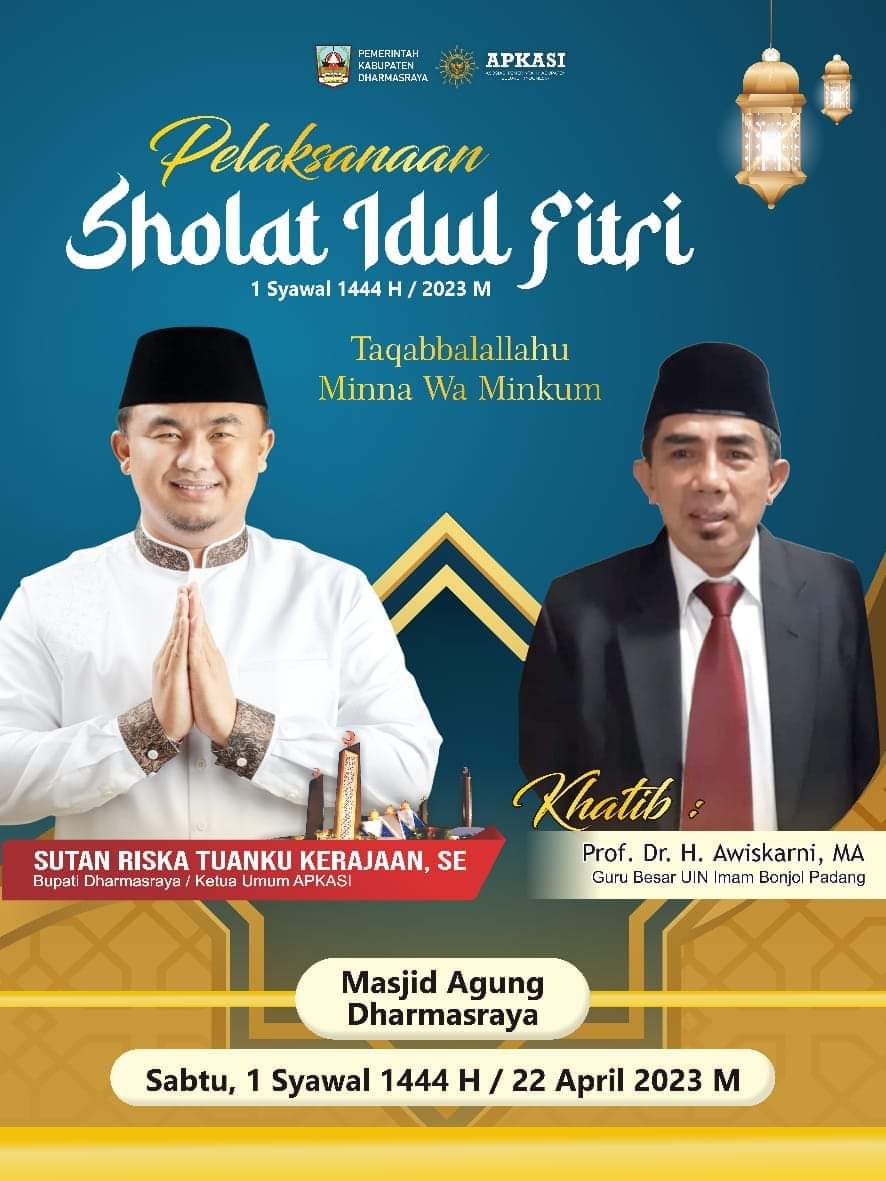 Adapun yang bertindak selaku khatib, Profesor Awis Karni, Guru Besar Universitas Islam Negeri Imam Bonjol Padang, dan Shalat Ied akan dipimpin langsung Imam Masjid Agung Dharmasraya, Ustad Dolizal Putra. Selain dikenal sebagai Imam Masjid Agung Dolizal merupakan Qari Dharmasraya yang pernah menjuarai MTQ Tingkat Nasional.